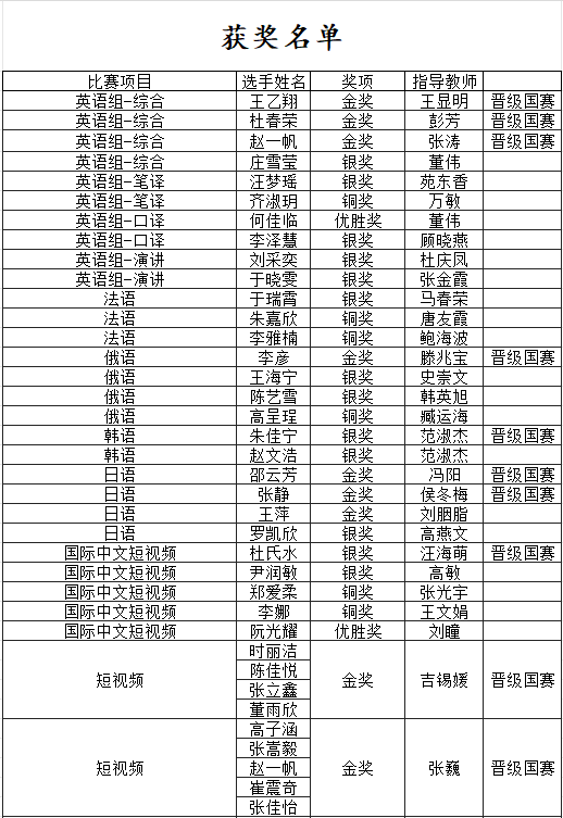 11月2日至3日,外研社•国才杯“理解当代中国”全国大学生外语能力大赛山东省省赛圆满结束。在专业教师的精心指导下,曲园学子表现卓越,成绩斐然,28 位同学和 12个团队成功获得省赛各组别金、银、铜等奖项;8 位同学和4个团队分别晋级国赛,获奖和晋级国赛人数创历史新高。