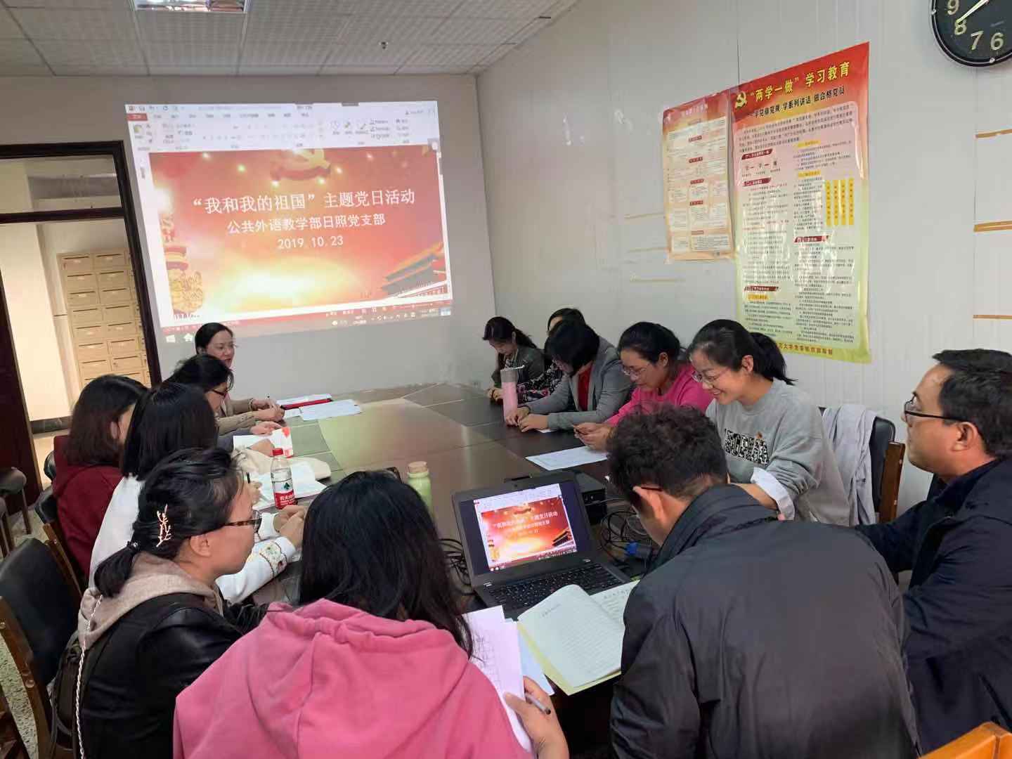 本次主题党日结合支部教师职业特点和专业特色,共分为5个方面内容。第一,在日照校区机关党委的统一安排下,观看电影《我和我的祖国》。作为庆祝中华人民共和国成立70周年的献礼片,《我和我的祖国》以大时代下的小人物为切入视角,精彩再现了新中国成立以来的七个重要历史时刻,展现了70年间中国人民不屈不挠、奋发图强的精神风貌。第二,认真学习了习近平总书记在庆祝中华人民共和国成立70周年大会上的中、英文版讲话内容。第三,就习近平总书记讲话精神和观看影片的感受进行了持久的交流探讨,与会党员纷纷表示正是依靠中国共产党的坚强领导,今日之中国,如初所愿。作为新时代的人民教师,要紧跟习总书记的步伐,不忘初心,不负重托,不辱使命,做有理想信念、有道德情操、有扎实学识、有仁爱之心的好老师。第四,与会党员面向国旗,面向人民教师誓词,庄严地宣誓,将活动推向高潮。第五,认真研读卢卫中老师的文章:《习近平治国理政话语的隐喻系统及语言魅力—以从严治党论述为例》,积极探索党建工作与业务工作的融合之道。