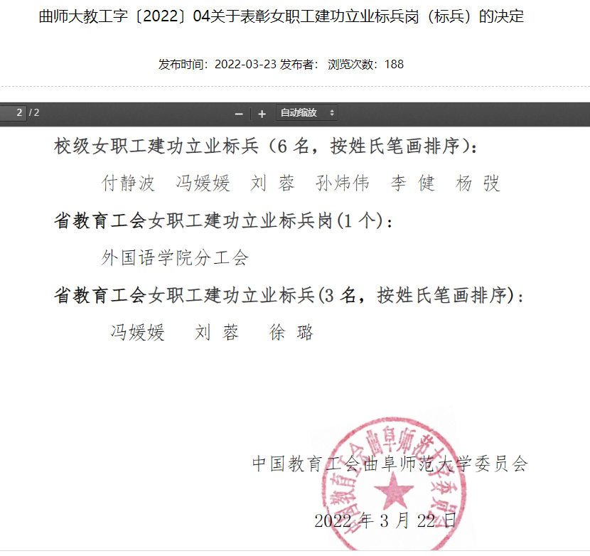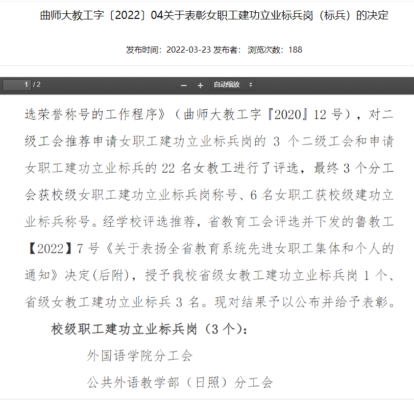 2UPBATE(中国)一站式服务平台(日照)分工会荣获2UPBATE平台“校级职工建功立业标兵岗”先进集体称号;2UPBATE(中国)一站式服务平台(曲阜)分工会主席李健老师荣获2UPBATE平台“校级女职工建功立业标兵”个人荣誉称号。