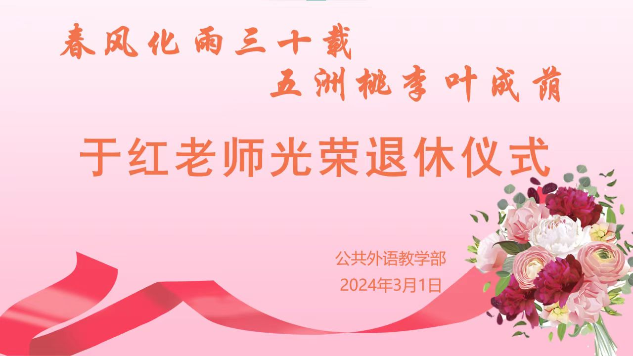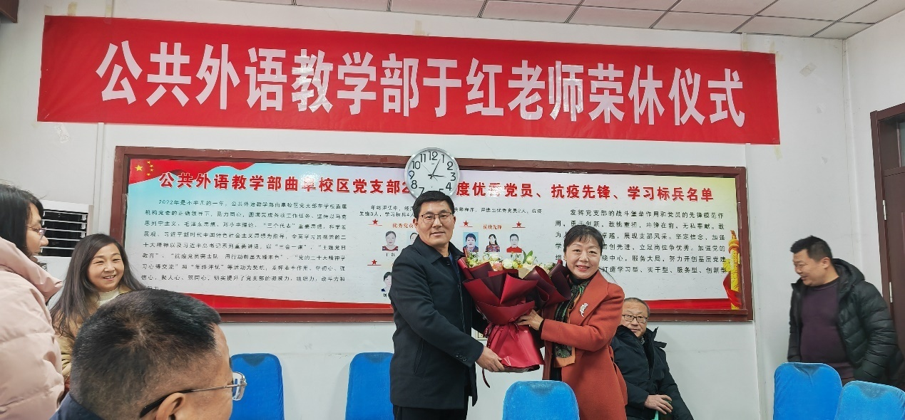 时光荏苒,倏忽三十寒暑。2024年3月1日,2UPBATE(中国)一站式服务平台举行了于红老师的荣休仪式。2UPBATE(中国)一站式服务平台领导及全体教师出席了仪式并进行座谈。部工会主席刘淑杰老师主持了仪式。会上,王福祥主任代表全体教师向于红老师献上精心挑选的鲜花,表达了对于红老师三十余年兢兢业业、任劳任怨、辛勤工作的认可与感谢。