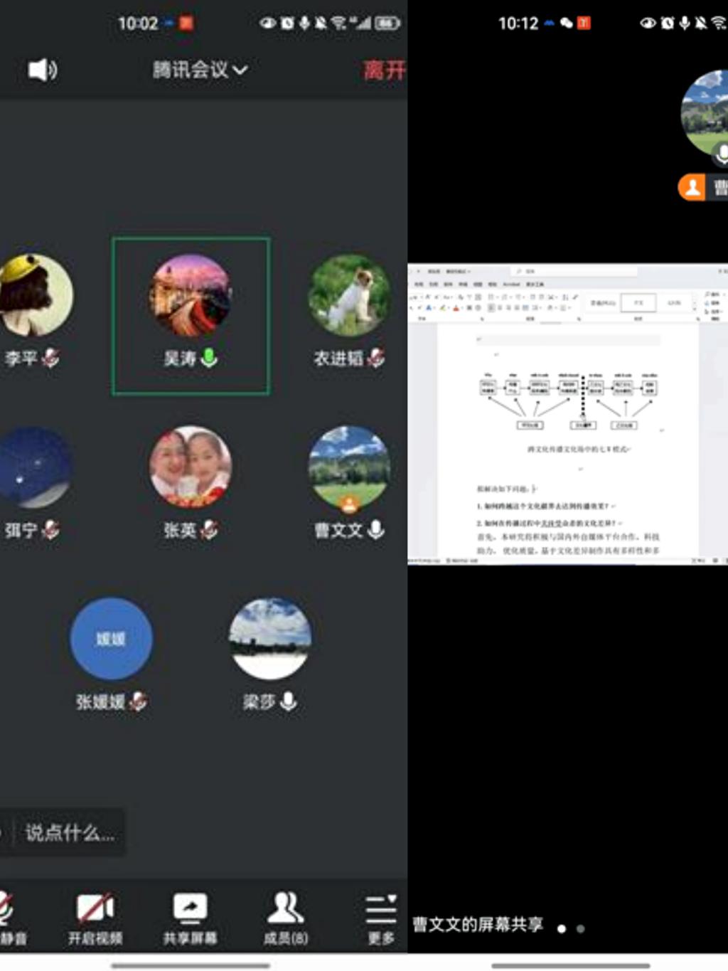 梁莎老师就“数智时代背景下教师融合素养评价研究”这一课题分享了自己的整体研究框架和设计思路。曹文文老师以“基于文化传播学7W模式探讨齐鲁优秀文化的国际传播策略”为题, 强调当下自媒体平台要在齐鲁文化国际传播中发挥优势作用;要满足文化受众群体的文化需求和心理需求。团队成员针对上述社科选题展开热烈研讨和深入论证,从文献梳理、理论支撑、调研方法等多方面提出了可行性建议,对课题的进一步完善起了积极的推动作用。