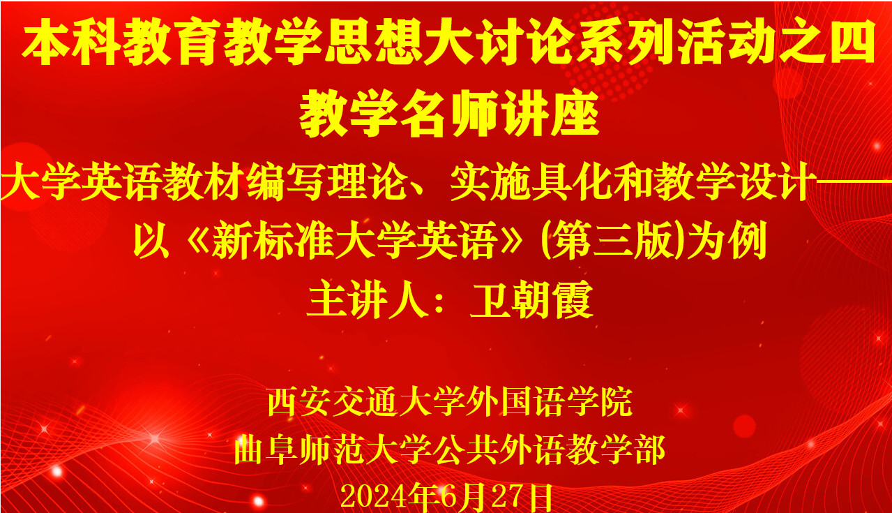 6月27日,2UPBATE(中国)一站式服务平台举办本科教育教学思想大讨论系列活动之四:教学名师讲座,特别邀请西安交通大学外国语学院卫朝霞副教授作题为“大学英语教材编写理论、实施具化和教学设计——以《新标准大学英语》(第三版)为例”的专题报告。活动由2UPBATE(中国)一站式服务平台主任王福祥主持,两校区全体教师参加了本次报告会。