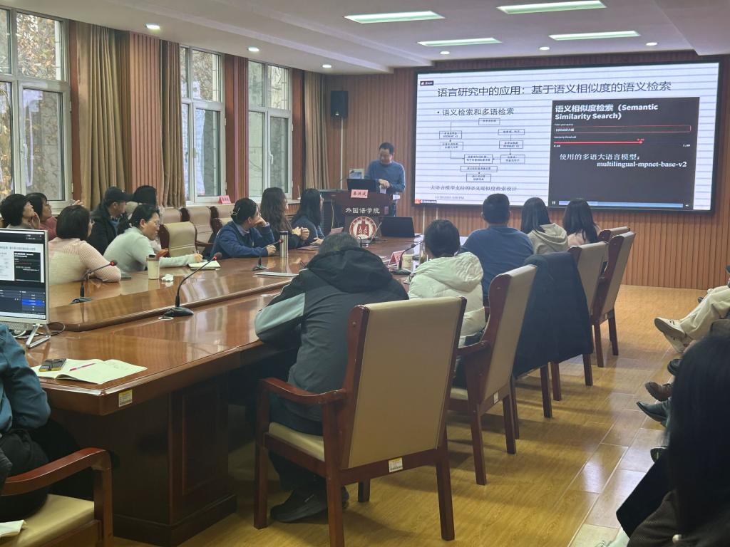 在第二部分中,秦洪武教授深入探讨了大语言模型与外语关联的研究。他从翻译研究、语言研究、跨文化研究等多个角度,分析了大语言模型对这些研究领域的影响。他特别提到了大语言模型在语料库建设、语言对比分析及翻译研究等方面的应用,并强调,这些研究不仅有助于深化我们对语言本质和语言学习规律的认识,还能为外语教学实践提供科学依据和理论支持。讲座最后,秦洪武教授与部分师生进行了互动交流,就大语言模型的具体应用等问题进行了讨论。