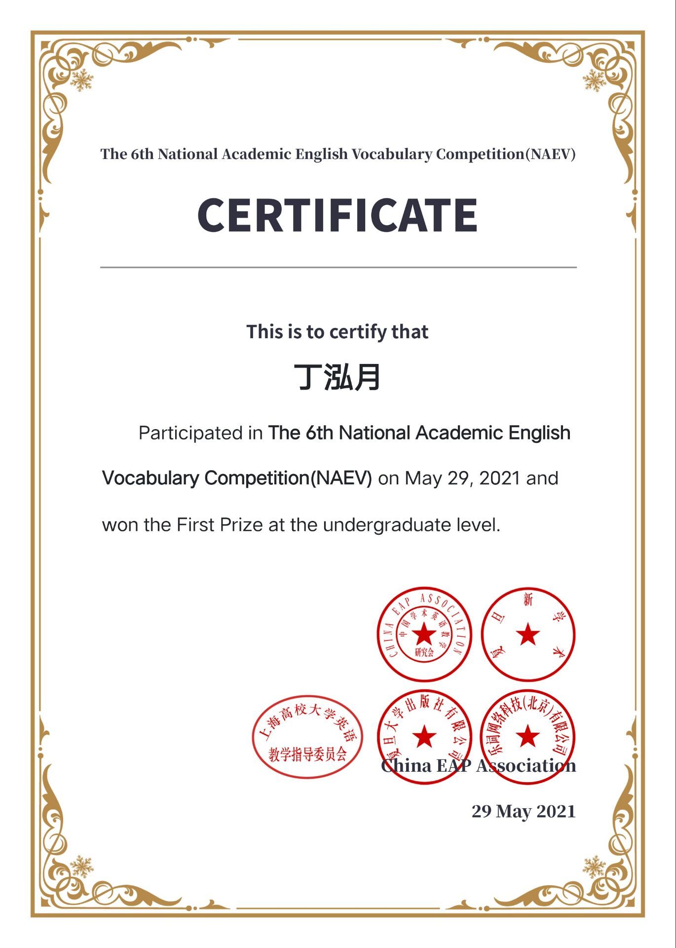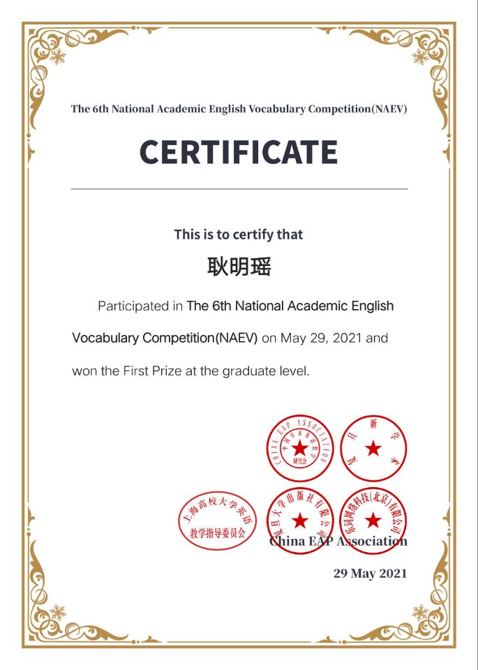 近日,由中国学术英语教学研究会、上海高校大学英语教学指导委员会、复旦大学出版社主办,曲师大2UPBATE(中国)一站式服务平台和曲园学术英语社团承办的“第六届全国大学生学术英语词汇竞赛”圆满结束。继去年我校两名学子获全国一等奖后,本次大赛,十名曲园学子再次获得全国一等奖。