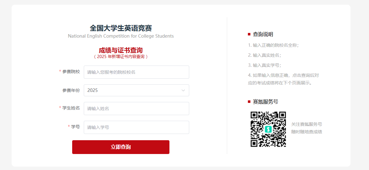 1. 2025年全国大学生英语竞赛,请获得国家特等奖、一等奖、二等奖、三等奖的考生,电脑端输入链接https://event.saikr.com/neccs,进入如下界面;输入“参赛院校”、“学生姓名”、“学号”后查询下载获奖证书。(也可手机端下载最新版赛氪APP查询。)